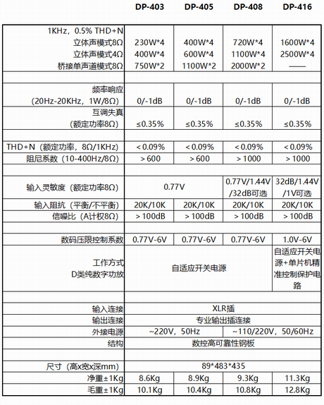 DP系列数字功放,小功率可用会议系统,中大功率用途广泛,从K房娱乐、酒吧到演艺线阵都有广泛应用前景。DP系列有各种通道的机型,功率从8Ω85W至8Ω1600W各功率阶段齐全。